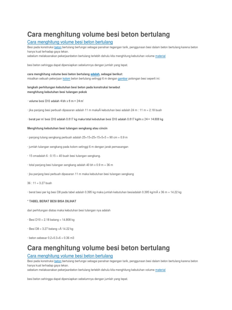 Ciptamedia Ilmu TABEL BERAT BESI BETON. Rumus volumenya yaitu total panjang kolom x luas penampang kolom. Penjelasan mengenai cara menghitung kebutuhan Beton.